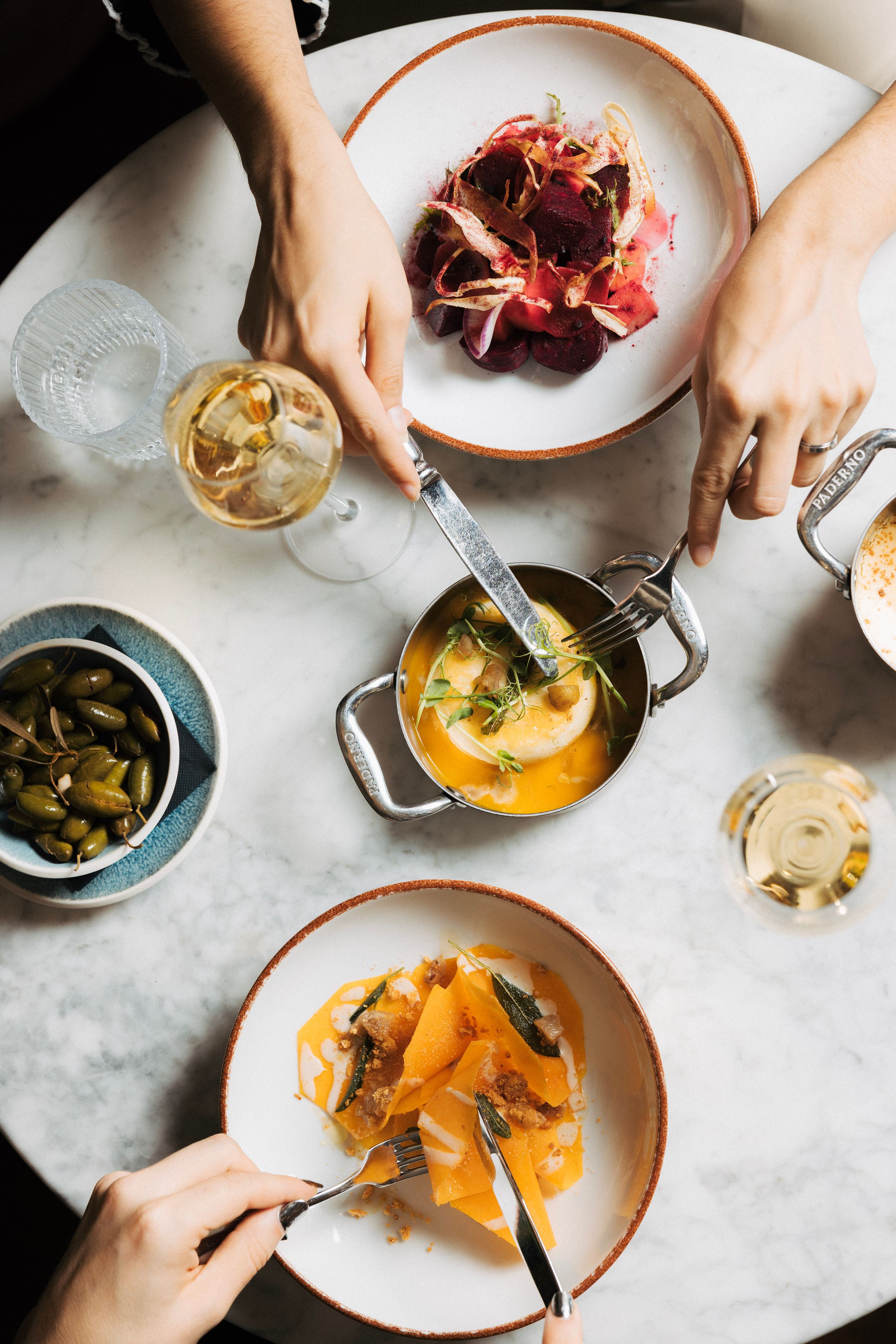 At Volta, Andrea’s cooking champions fresh, seasonal produce and timeless techniques, bringing together influences from Spain and Italy in ways that are both authentic and inventive. Our philosophy is simple: honour the ingredient, let the seasons guide us, and create sharing dishes that celebrate connection at the table. Three signature plates anchor the menu: tender Girona roast beef, gently cooked and finished with a Mediterranean flourish; red prawn tartare from local waters, balanced with smooth salmorejo and creamy ricotta; and a tempura parmigiana, set on aubergine cream with confit tomato mayo and pesto.
